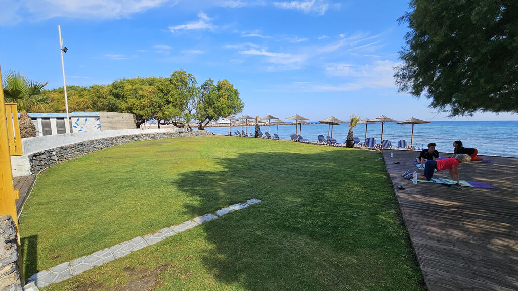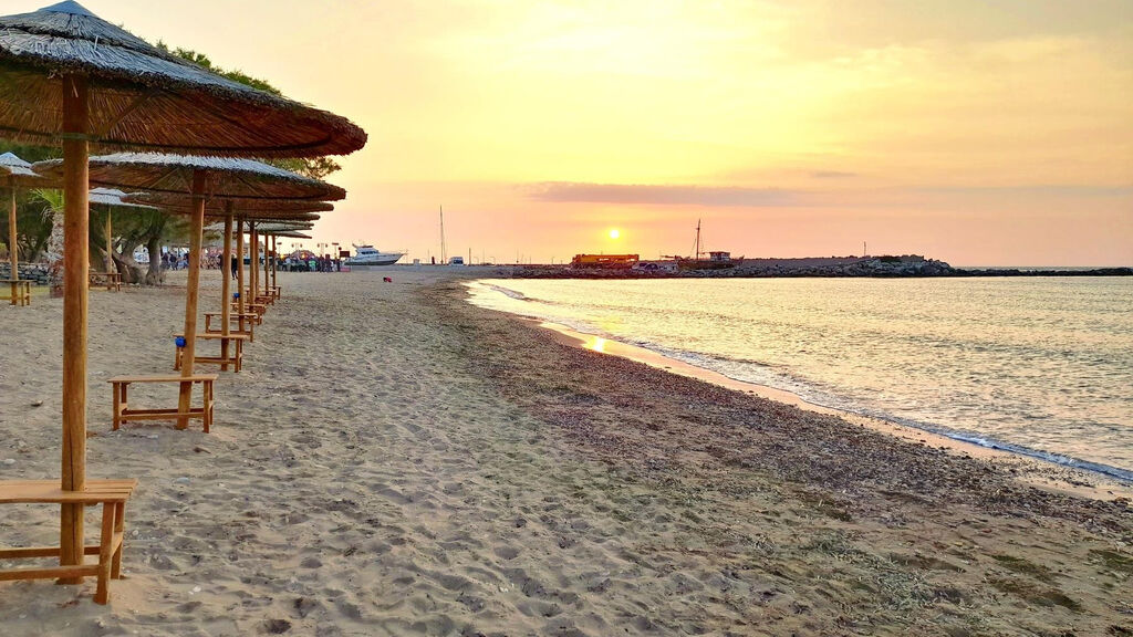Pláž:Oblázková pláž s pozvolným vstupem do moře oddělená místní komunikací. Lehátka a slunečníky zdarma.