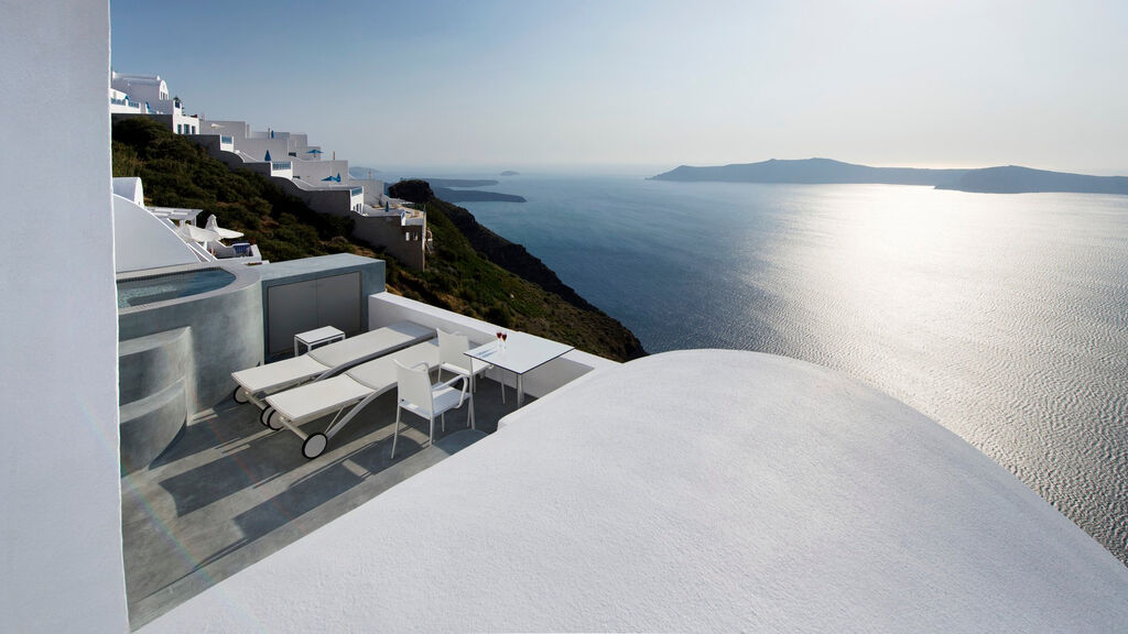 Slunečná terasa s bazénem a výhledem do okolía na kalderu