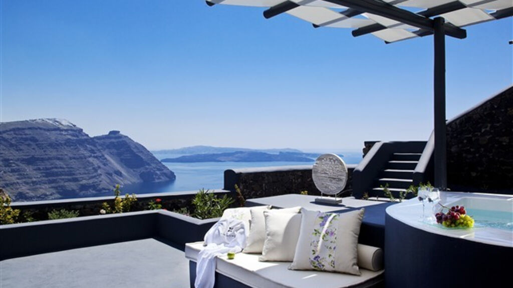 Luxusní hotel San Antonio vybudovaný na skále v oblasti mezi městečky Oia a Imerovigli nabízí úchvatné výhledy na moře a scenérie protější Kaldery. Díky úrovni služeb a architektonickému ztvárnění byl hotel zařazen do Small Luxury Hotels of the World. Romantická atmosféra místa je ideální pro svatební cesty. Z bezpečnostních důvodů není povoleno ubytování dětí mladších 13 let.