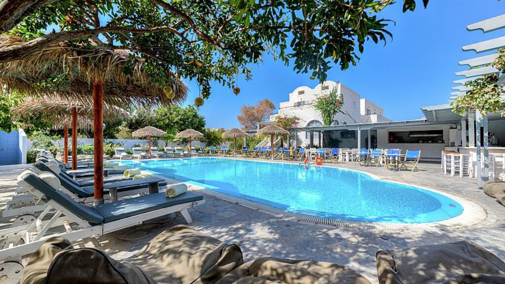 Hotel postavený v tradičním místním stylu nabízí rodinnou atmosféru a příjemné ubytování. Poloha jen kousek od centra letoviska Kamari a pláže s černým lávovým pískem zaručuje strávení krásné a romantické dovolené. Hotel je ideálním místem nejen pro novomanžele.