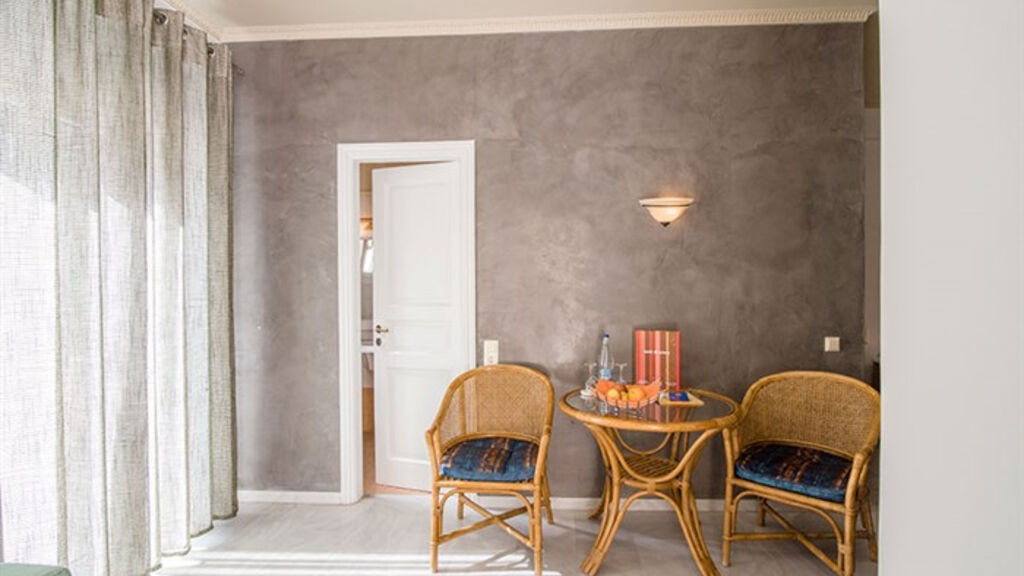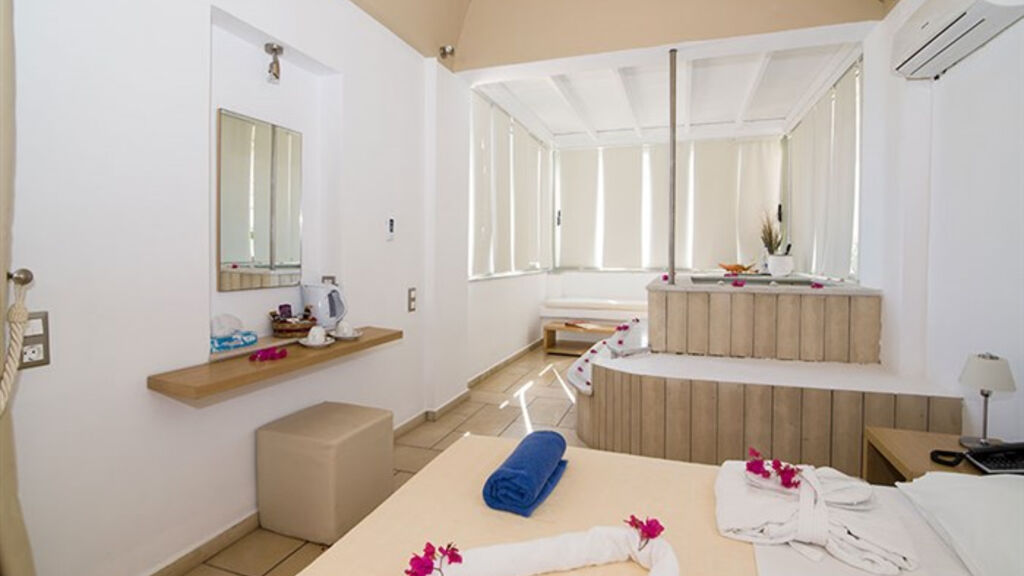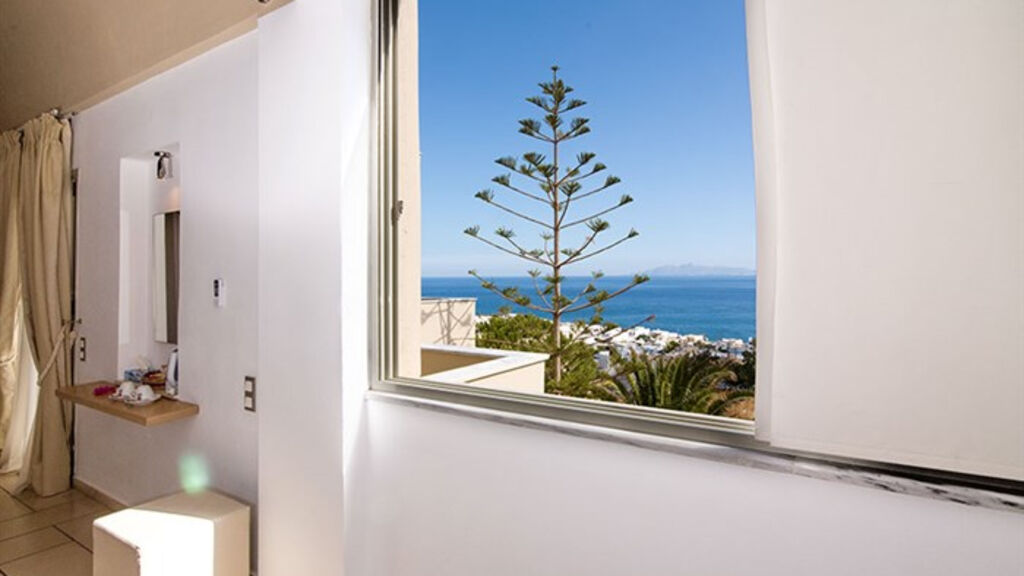 Hotel s kvalitními službami, postavený v tradičním kykladském stylu, se nachází na klidném úbočí hor s krásným výhledem na letovisko Kamari a Egejské moře. Moderně zařízené pokoje nabízejí pohodlí s výhledem na okolní krajinu. Hosté mohou relaxovat u bazénu nebo využít wellness centrum se saunou a masážemi. V blízkosti se nachází pláž Kamari, ideální pro vodní sporty a procházky. Hotel doporučujeme pro páry, rodiny i náročnější hosty, kteří hledají klidnou a pohodovou dovolenou.
