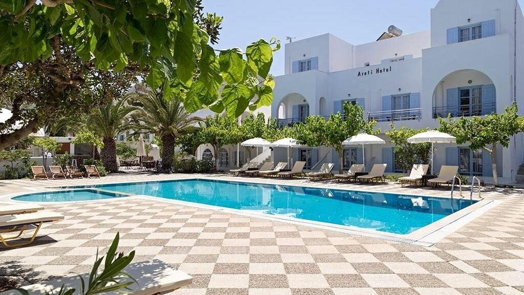 Základní informace:Menší rodinný hotel Areti, zařízený v kykladském stylu, se nachází na klidném místě na okraji letoviska Kamari. Dlouhá, široká pláž s tmavým vulkanickým pískem se nachází cca 500 metrů od hotelu. Podél pláže naleznete promenádu s množstvím restaurací a barů. Při konzumaci v určitých barech pak máte lehátka a slunečníky na pláži zdarma. Hotel doporučujeme všem věkovým kategoriím i rodinám s dětmi pro které jsou k dispozici velké pokoje.