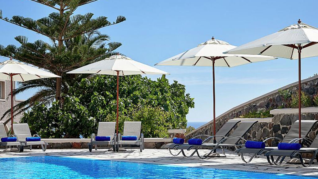 V klidné lokalitě v kopci na okraji letoviska Kamari, cca 8 km od hlavního města Thira a cca 5 km od letiště. V nedalekém centru letoviska restaurace, bary, obchody, diskotéka a autobusová zastávka.