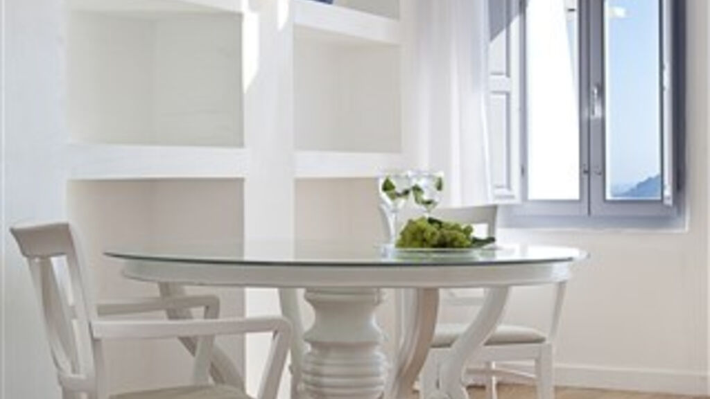 Dvoulůžkový pokoj Interiér 25 m², klimatizované dvoulůžkové pokoje s koupelnou a WC, vysoušeč vlasů, telefon, SAT/TV, trezor na laptop, minibar, koupací pláště a pantofle, připojení k internetu a terasa s výhledem na kalderu. Maximální obsazenost 2 osoby.Junior suita Interiér 30 m², klimatizované pokoje některé s podkrovní ložnicí a obývacím pokojem. Koupelna s WC, vysoušeč vlasů, telefon, SAT/TV, trezor na laptop, minibar, koupací pláště a pantofle, připojení k internetu a terasa s výhledem na kalderu. Maximální obsazenost 3 osoby.Senior suita Interiér 35 m², klimatizované pokoje s ložnicí a obývacím pokojem. Koupelna s jacuzzi a WC, vysoušeč vlasů, telefon, SAT/TV, trezor na laptop, minibar, koupací pláště a pantofle, připojení k internetu a terasa s výhledem na kalderu. Maximální obsazenost 3 osoby.Superior suitaInteriér 40 m², klimatizované pokoje s ložnicí a obývacím pokojem. Koupelna s vanou, jacuzzi a WC, vysoušeč vlasů, telefon, SAT/TV, trezor na laptop, minibar, koupací pláště a pantofle, připojení k internetu a terasa s výhledem na kalderu. Maximální obsazenost 3 osoby.Novomanželská suita Interiér 45 m², klimatizované pokoje s ložnicí a obývacím pokojem. Koupelna s vanou, jacuzzi a WC, jídelna na terase, vysoušeč vlasů, telefon, SAT/TV, trezor na laptop, minibar, koupací pláště a pantofle, připojení k internetu a terasa s výhledem na kalderu. Maximální obsazenost 2 osoby.Suita Katikies Interiér 50 m², klimatizované pokoje s ložnicí a obývacím pokojem. Koupelna s vanou, jacuzzi a WC, jídelna na terase, vysoušeč vlasů, telefon, SAT/TV, trezor na laptop, minibar, koupací pláště a pantofle, připojení k internetu a terasa s výhledem na kalderu. Maximální obsazenost 2 osoby.
