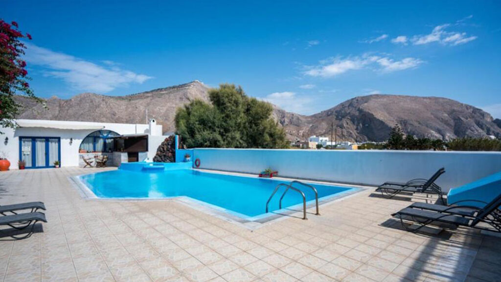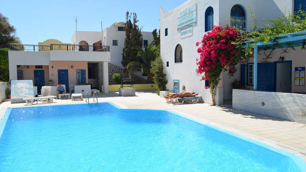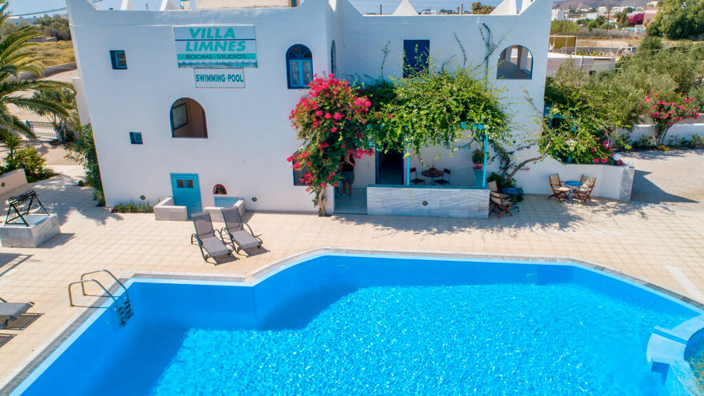 Villa LIMNES s bazénem (lehátka a slunečníky u bazénu zdarma) je situována 80 m od písečné pláže letoviska Perissa. Studia pro 2–3 osoby jsou vybavena kuchyňským koutem, soc. zařízením, balkónem/terasou, TV a klimatizací zdarma. Wi-fi připojení je k dispozici zdarma u baru.