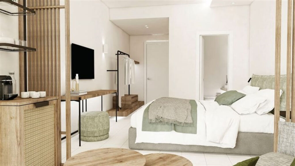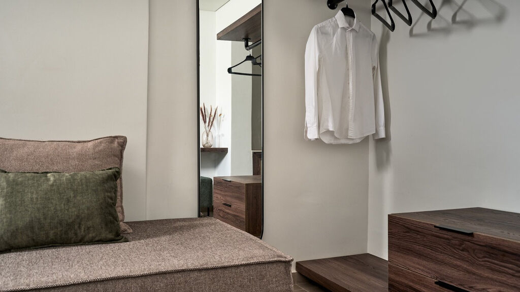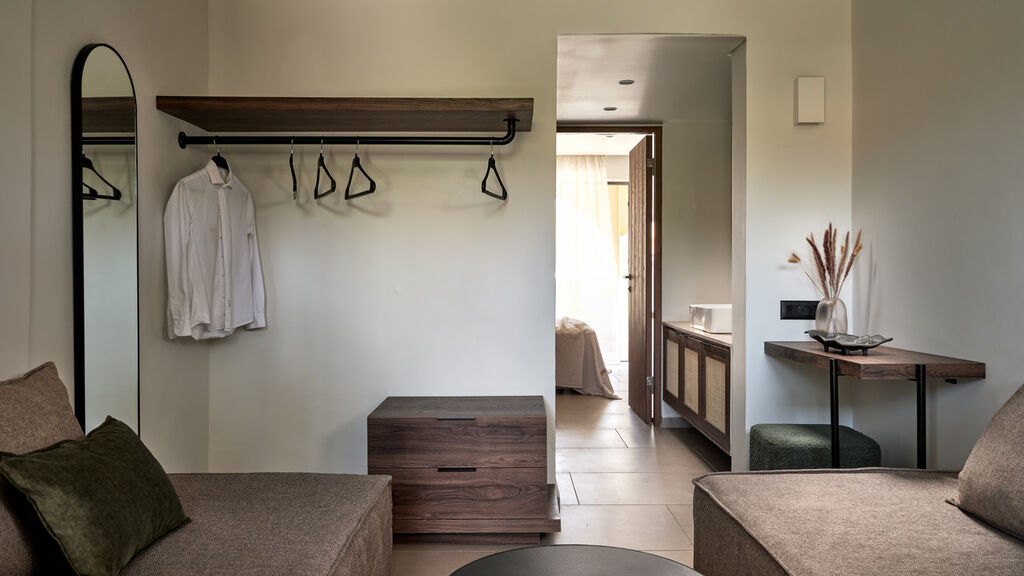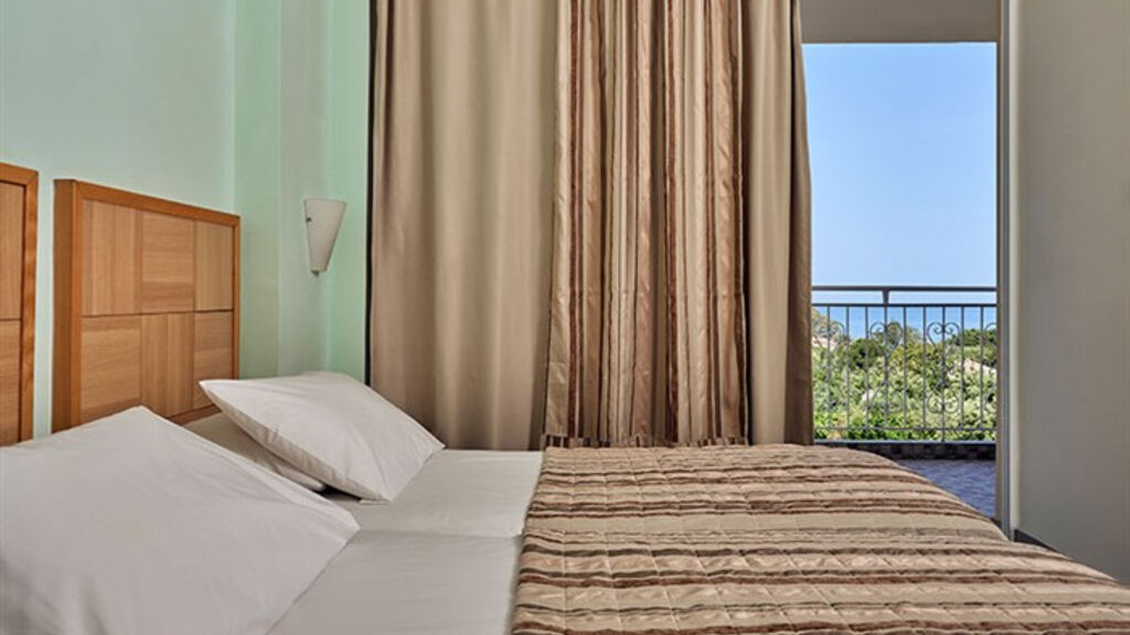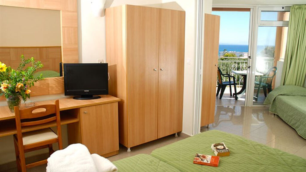 AP: koupelna/WC (vysoušeč vlasů), obývací část s kuchyňským koutem, ložnice oddělená průhlednými posuvnými dveřmi, klimatizace, TV/sat., trezor za poplatek, balkon nebo terasa. ST: viz. AP, 1 místnost.