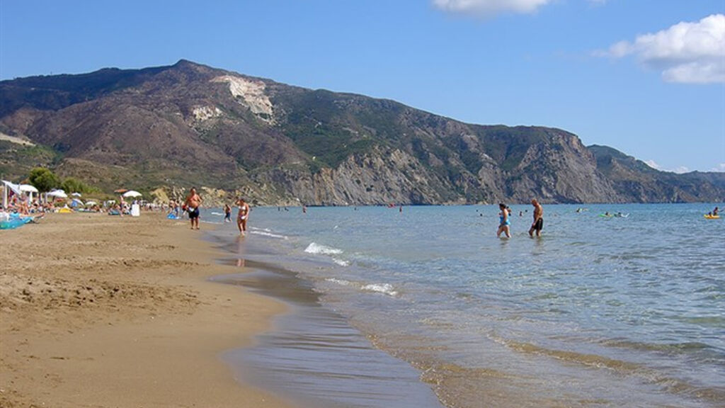 Jedna z nejkrásnějších písečných pláží na ostrově s pozvolným vstupem do moře je vzdálena cca 450 m, lehátka a slunečníky za poplatek. Pláž Kalamaki se z důvodu výskytu želv Caretta caretta na noc uzavírá.