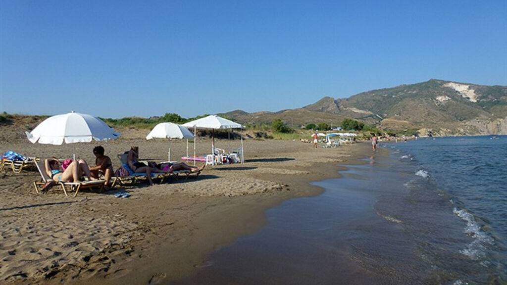 Písečná pláž s pozvolným vstupem do moře cca 300 m. Pláž Kalamaki je přírodní hnízdiště slavných želv karet. Lehátka a slunečníky za poplatek.