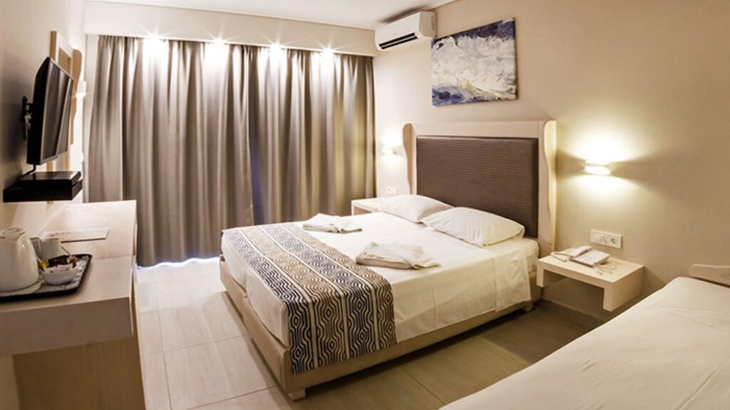Hotelový komplex v krásné zahradě, situován na klidném místě cca 400 m od centra střediska Kalamaki s bary, tavernami a obchody, cca 4 km od živého letoviska Laganas, cca 4 km od hlavního města a cca 6 km od letiště.
