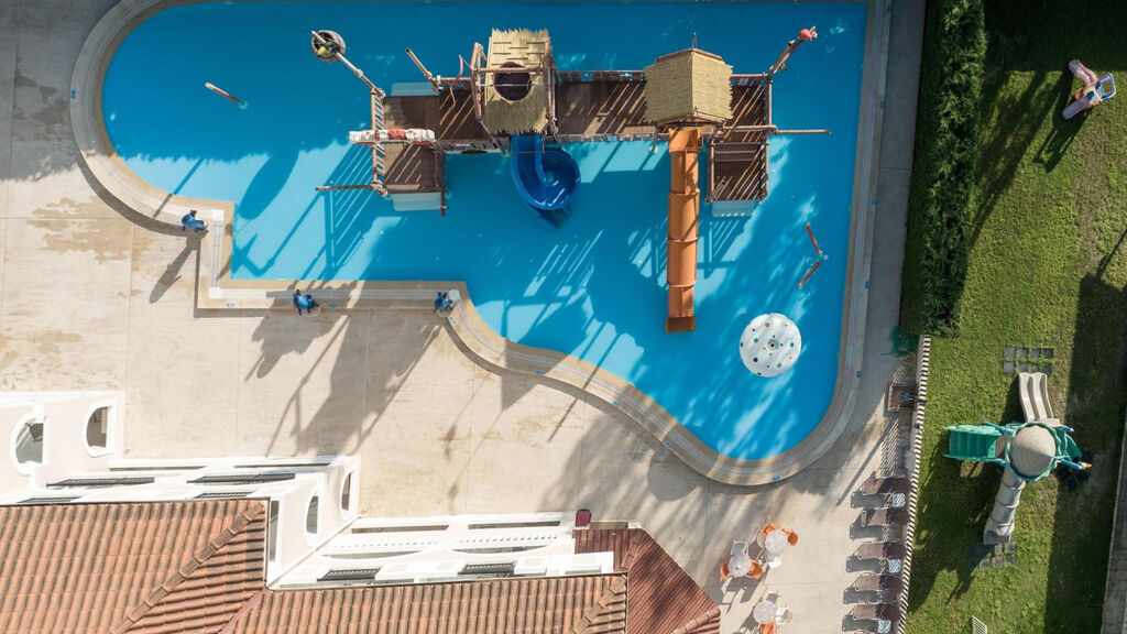 118 pokojů umístěno v pěti blocích, vstupní hala s recepcí, lobby bar, restaurace, WIFI zdarma v celém areálu, střešní terasa. Venku 3 bazény (hlavní bazén s dětským bazén, bazén pouze pro dospělé osoby, dětský bazén Fun´n´splash), lehátka a slunečníky, ručníky zdarma, snack bar u bazénu, dětské hřiště.