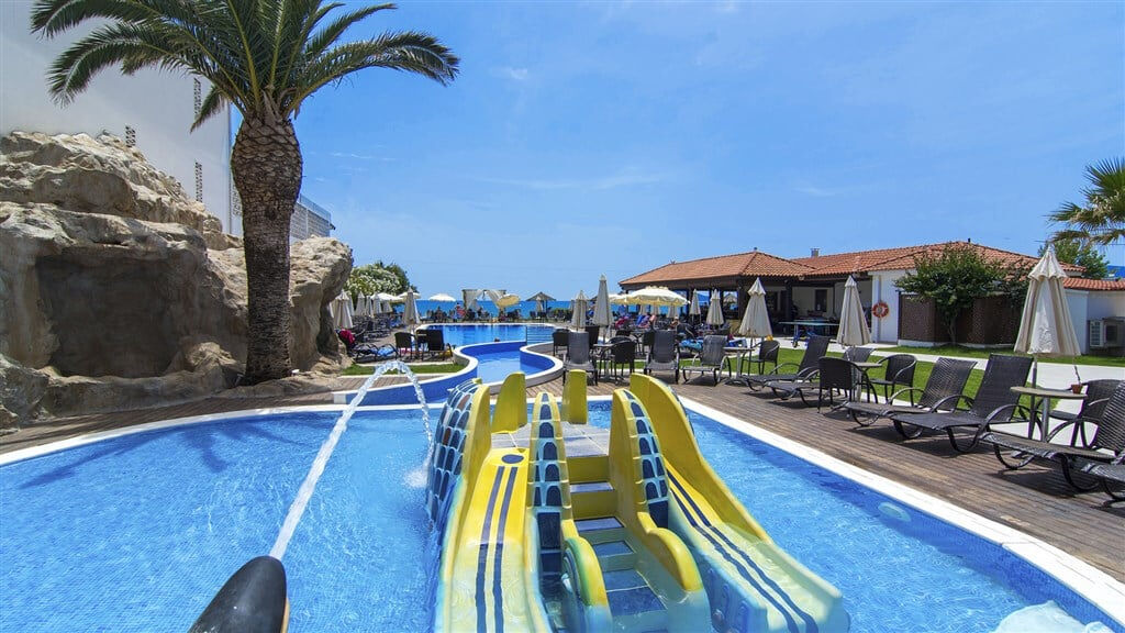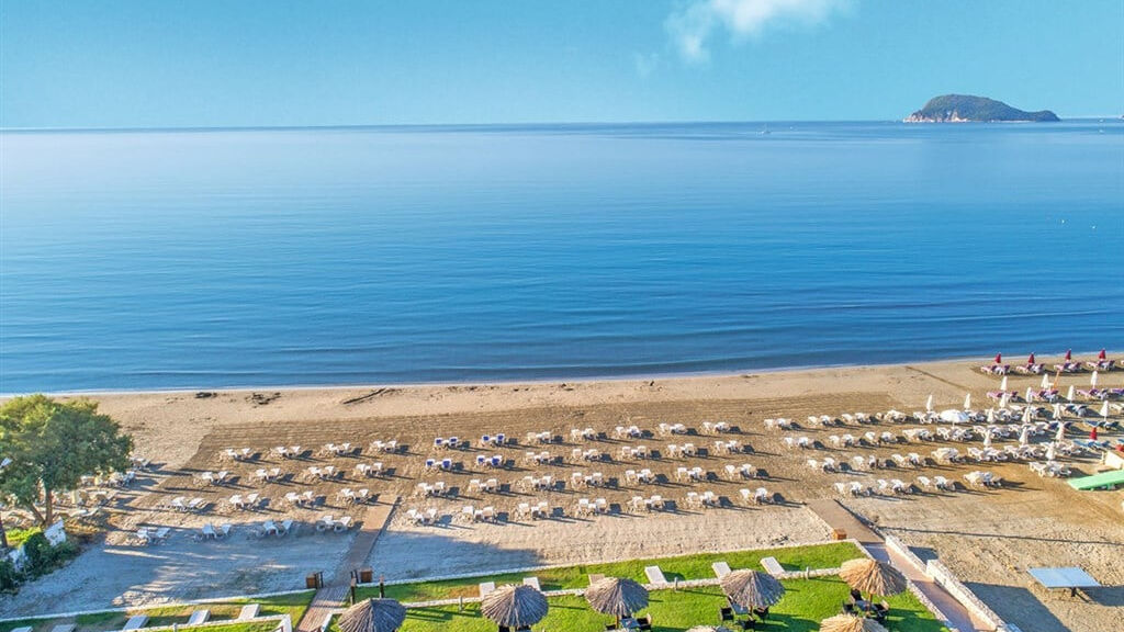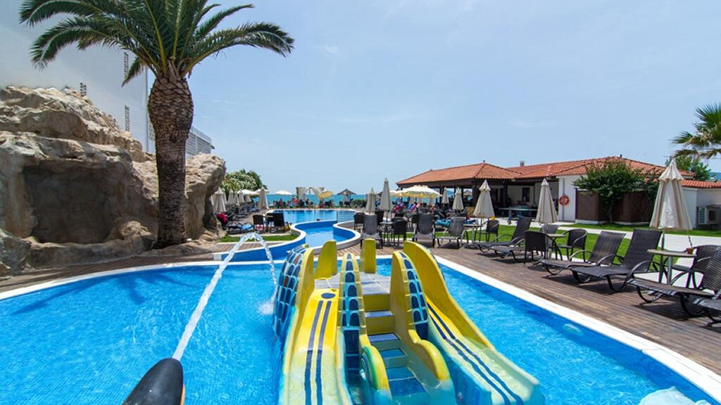 Kvalitní hotel skládající se z hlavní budovy a několika dalších budov se nachází přímo na pláži a nabízí vysoký standard ubytování, služeb i bohatou škálu denních aktivit. Široká písečná pláž je známá výskytem chráněné želvy Caretta-Caretta. Centrum živého letoviska Laganas s možností večerní zábavy je vzdáleno 500 m od hotelu, hlavní město Zakynthos 8 km. Hotel je vhodný pro náročnější klientelu všech věkových kategorií, především však pro rodiny s dětmi. Hotel vybírá vratnou kauci cca 50 €, případně požaduje číslo kreditní nebo platební karty jako záruku pro případ škod na zařízení.