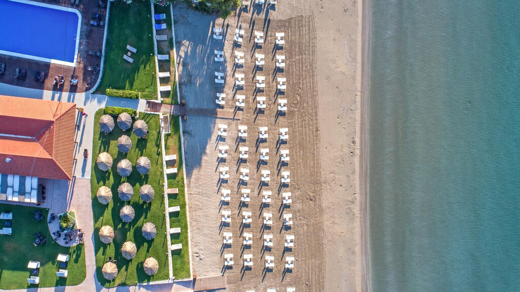 Pláž:Dlouhá písečná pláž s pozvolným vstupem do moře, lehátka a slunečníky za poplatek.