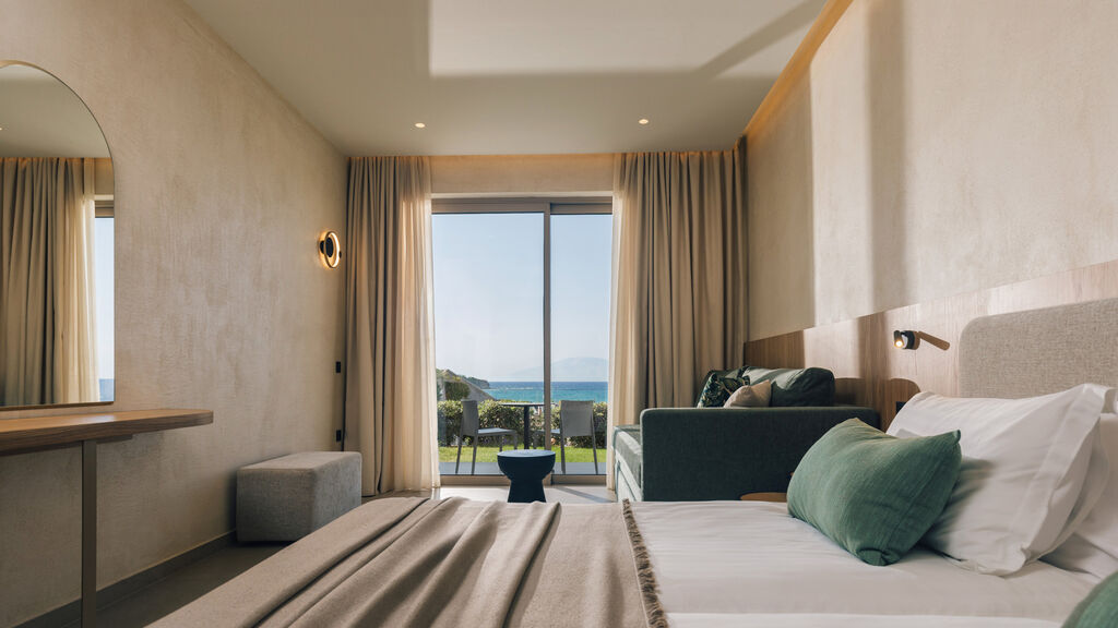 dvoulůžkové pokoje Standard, dvoulůžkové pokoje Standard s možností přistýlky s výhledem na moře, dvoulůžkové pokoje s možností přistýlky se sdíleným bazénem s výhledem na moře, rodinné pokoje až pro 4 osoby (bungalov, 1 místnost), rodinné pokoje až pro 4 osoby s výhledem na moře (bungalov, 1 místnost), koupelna s toaletou, fén, klimatizace, trezor, Wi-Fi, SAT/TV, lednice, set na přípravu čaje/kávy, balkon nebo terasa, dětská postýlka na vyžádání zdarma,