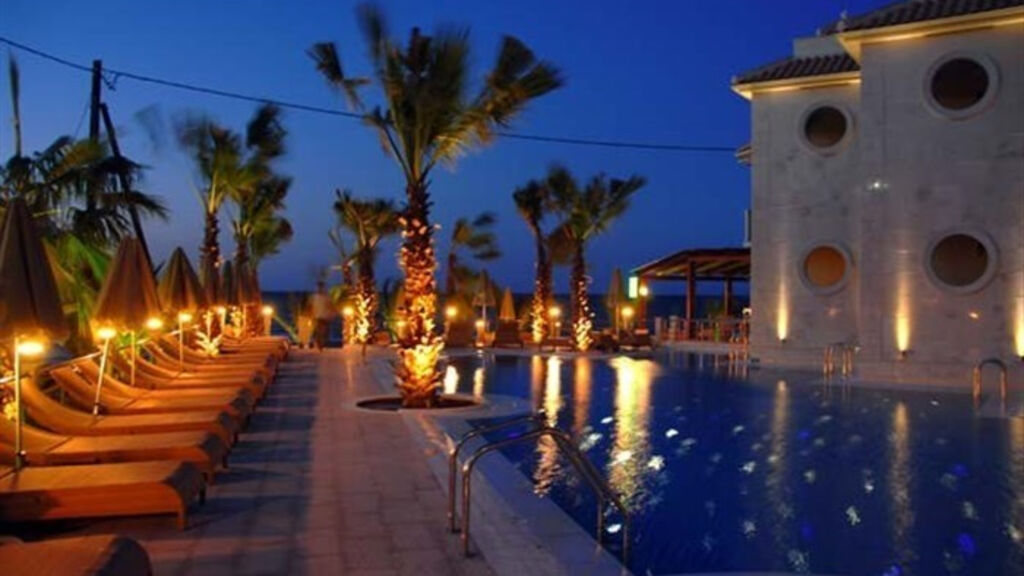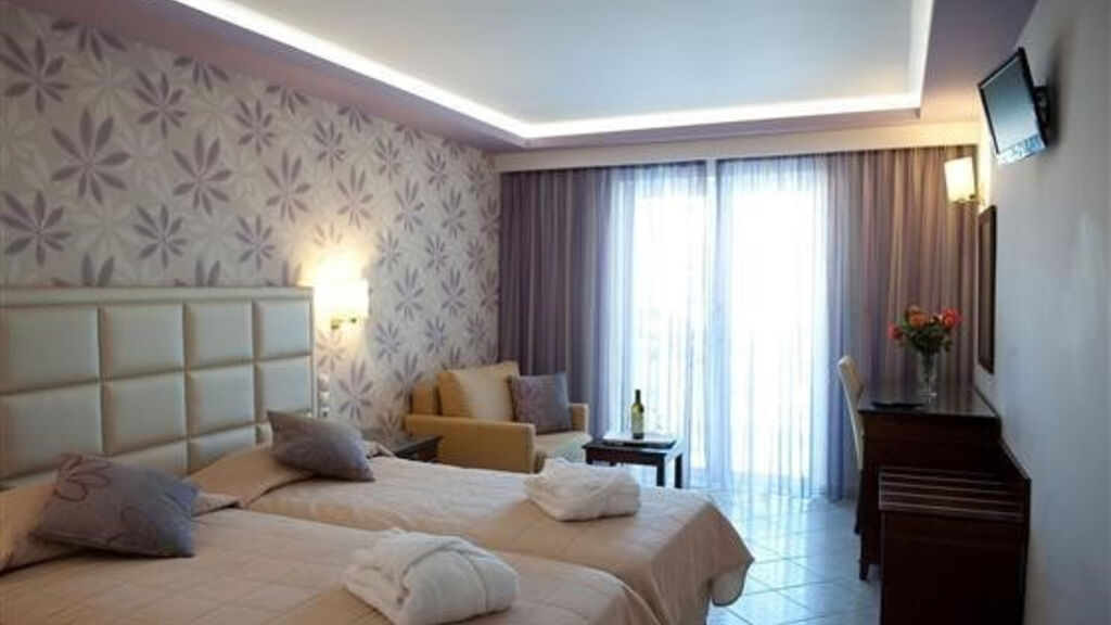 Pláž:Přímo u písečno-oblázkové pláže s pozvolným vstupem do moře, lehátka a slunečníky za poplatek (cca 20 EUR/set). Charakter pláže může podléhat sezónním vlivům, doporučujeme boty do vody.