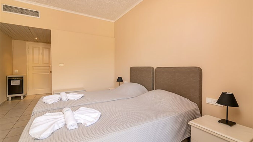 Dvoulůžkové pokoje s možností přistýlky mají vlastní příslušenství (koupelna, fén, WC), klimatizaci, SAT/TV, trezor, telefon, WIFI, rychvarnou konvici pro přípravu kávy/čaje, minichladničku a balkon nebo terasu s výhledem do zahrady nebo na bazén.
