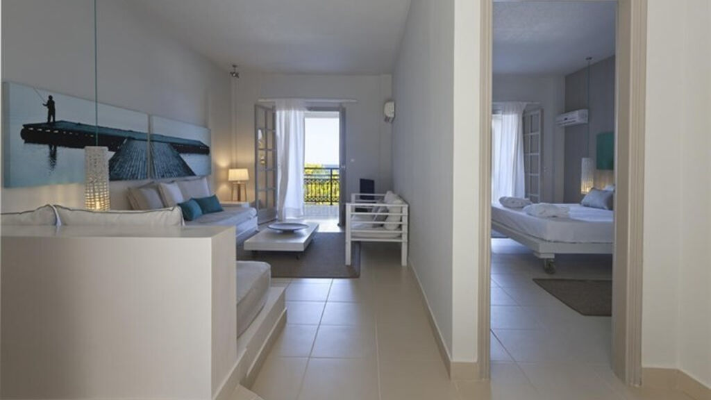 Junior suity s výhledem na moře má jednu místnost s ložnicí a obývací částí se sofa (přistýlky pro 2 osoby).