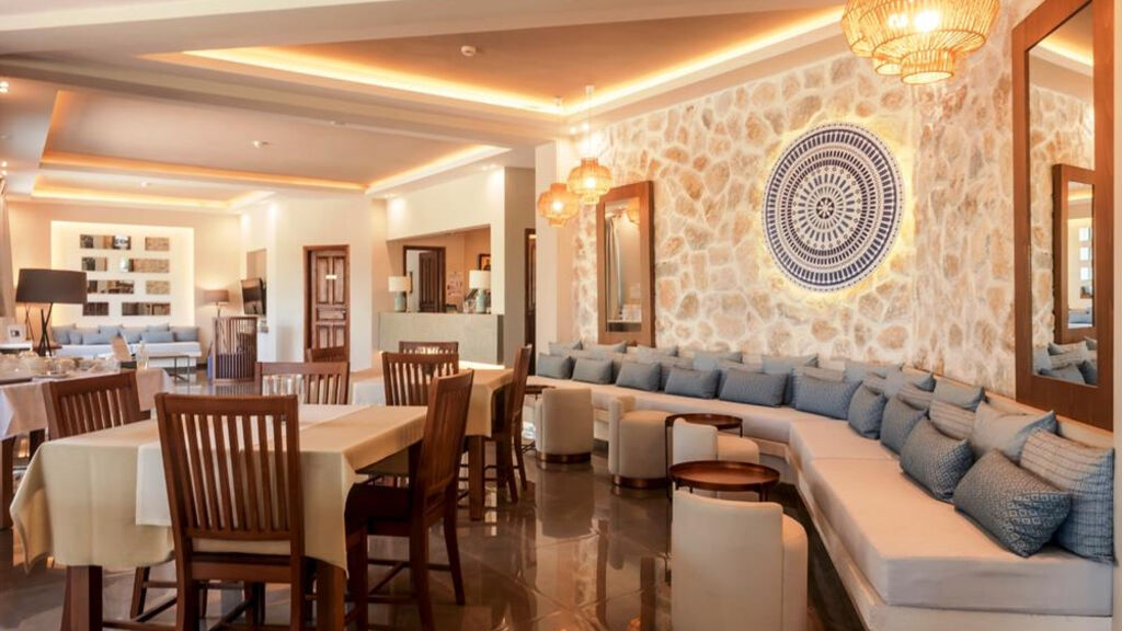 Junior suite má cca 55 m², oddělenou ložnici a 2 pohovky v obývací části, kuchyňku, stejné vybavení jako studia, jsou umístené v přízemí a mají privátní terasu s výhledem na bazén.