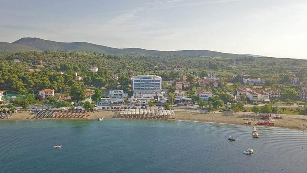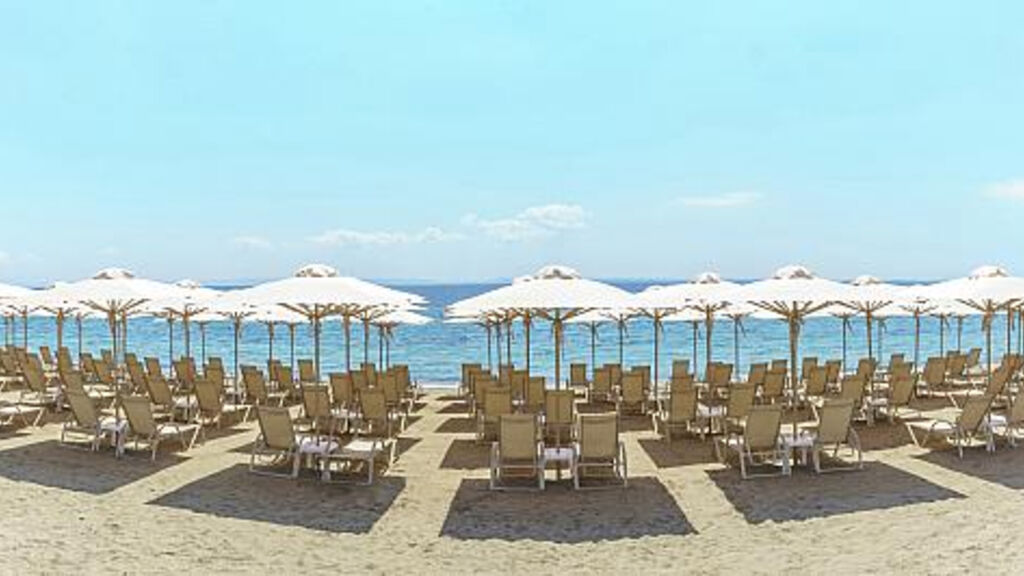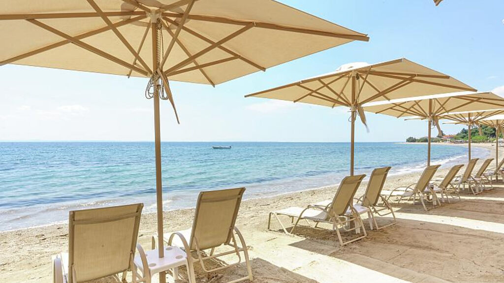 Dlouhá písečno-oblázková pláž oceněná modrou vlajkou pouze přes pobřežní komunikaci, hotel disponuje privátní částí s lehátky a slunečníky zdarma, plážové osušky na vratný depozit.