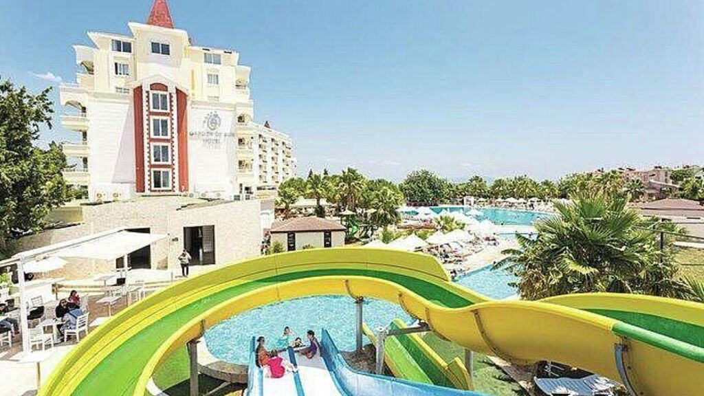 Vybavení hotelu:Hotelová hala s recepcí, hlavní restaurace, bar u bazénu, snack bar, à la carte restaurace (za poplatek), diskotéka, venkovní bazén, vnitřní bazén, bazén se skluzavkami, lehátka a slunečníky u bazénů, šipky, vodní pólo, vodní gymnastika, sauna, turecké lázně, fitness, plážové osušky, animační programy, minimarket, WiFi.