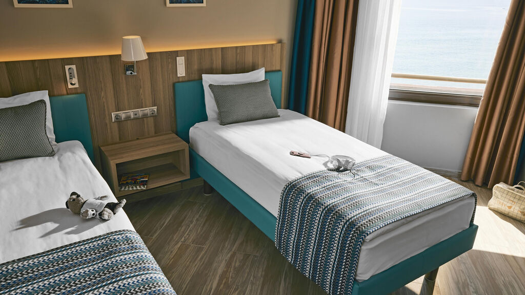 - Rodinný pokoj, 2 ložnice, Boční výhled moře: 2 ložnice a 1 koupelna, 2 balkony, velikost pokoje 43 m2.