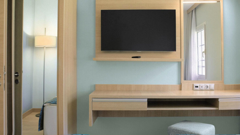 Vybavení pokojů:Dvoulůžkový pokoj, Hlavní budova: koupelna/WC. vysoušec vlasů, klimatizace, wifi (zdarma), telefon, TV, trezor (zdarma), minibar (při příjezdu naplněn vodou), set na přípravu čaje a kávy, balkon nebo terasa, velikost pokoje 30 m2.