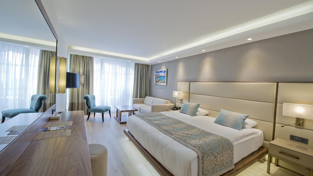 V pokojích je klimatizace, ústřední topení, obývací část, kuchyň a koupelna. Většina pokojů má balkón s krásným výhledem. Z některých pokojů mají hosté částečný výhled na moře. V pokojích je koberec, dvoulůžková postel a rozkládací pohovka. Je možné rezervovat oddělené ložnice. Pro děti jsou k dispozici dětské postýlky. Také je zde sejf a minibar. Ke standardnímu vybavení patří varná konvice/kávovar. Na pokoji je připojení k internetu, telefon, televize, rádio a WiFi (zdarma). Pro hosty je na pokoji připravena domácí obuv. Je možné rezervovat bezbariérové pokoje. V koupelnách je sprchový kout a vana. Také je tu vysoušeč vlasů. Je možné rezervovat koupelnu s bezbariérovým přístupem. Rodiny s dětmi si mohou rezervovat speciální rodinné pokoje.