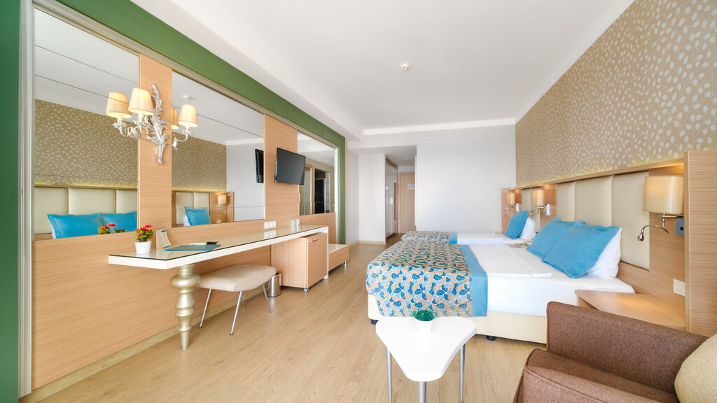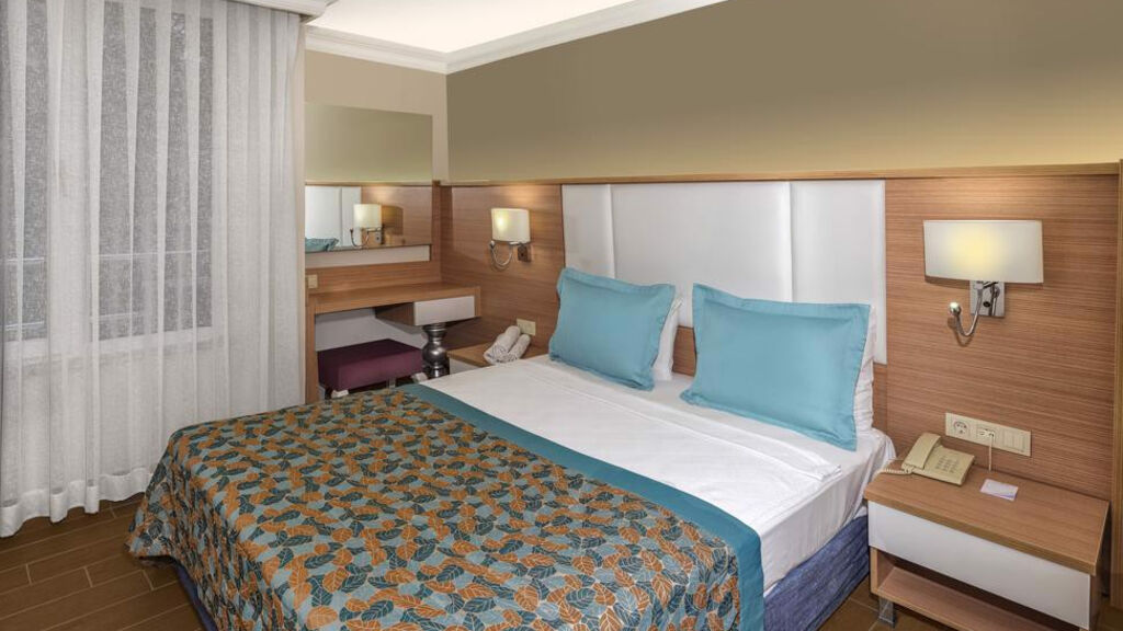 Nedávno zrekonstruovaný hotel tvořený z hlavní a vedlejší budovy přímo u pláže a s menším aquaparkem, se nachází v oblasti Konakli. Asi 15 km od centra Alanye a cca 120km od letiště v Antalyi. Hotel je vhodný jak pro páry, tak pro rodiny s dětmi a nabízí skvělé zázemí a zábavu pro každého. Doporučujeme náročnějším klientům. PLÁŽ Písčitá pláž před hotelem s pozvolným vstupem do moře – u vstupu malé kamínky. Plážové osušky, lehátka a slunečníky zdarma, plážový bar. UBYTOVÁNÍ Velmi vkusně a moderně zařízené standardní dvoulůžkové pokoje jsou vybavené koupelnou – sprcha/vana, WC, fénem, klimatizací, satelitní TV, telefonem, trezorem, minibarem (denně doplňovaný nealko nápoji), setem na přípravu čaje či kávy. Za příplatek – pokoje s přistýlkou, pokoje v hlavní budově, rodinné pokoje. STRAVOVÁNÍ Ultra All Inclusive – snídaně, pozdní snídaně, obědy, svačiny přes den a večeře formou bohatého bufetu. K dispozici i noční občerstvení. Neomezené množství nealkoholických i alkoholických nápojů místní výroby a některých importovaných nápojů 24 hodin. VYBAVENÍ Vstupní hala s recepcí, hlavní restaurace, 4 a la carte restaurací (rybí, italská, asijská a kebab), 5 barů, kavárna, cukrárna zdarma, Wi-Fi ve společných prostorách zdarma, 2 venkovní bazény, dětský bazén, vnitřní bazén, aquapark, miniklub, dětské hřiště, skluzavky, SPA centrum, konferenční místnost, herna, klenotnictví, fitness centrum, kadeřnictví, prádelna, lékař. AKTIVITY diskotéka, TV room, šipky, stolní tenis, tenis, kulečníky, stolní hry, plážový volejbal, fitness, sauna, turecké lázně, masáže (za poplatek), potápění, vodní sporty na pláži (za poplatek).