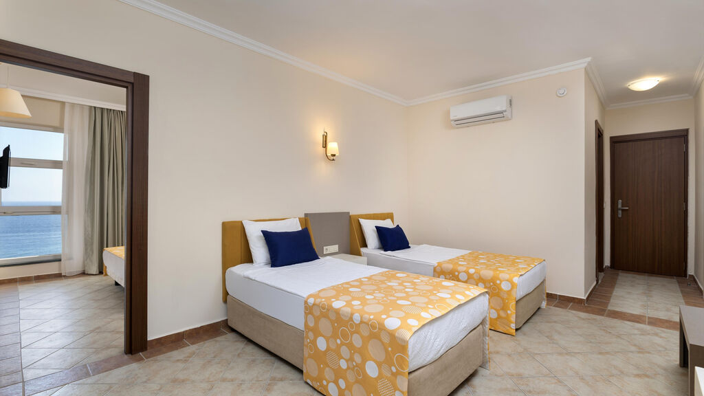 - Rodinný pokoj, částečný výhled na moře: 2 oddělené ložnice, cca 40 m2, s balkonem, čásetčný výhled na moře.
