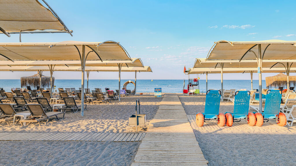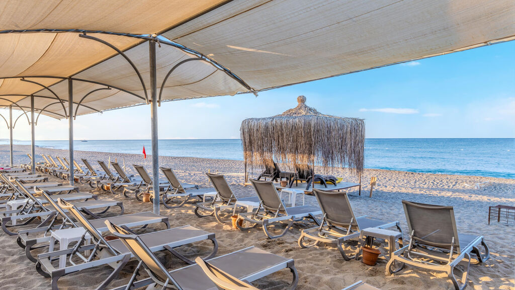 Pláž:Soukromá písečná pláž s drobnými oblázky přímo u hotelu, lehátka, slunečníky a osušky zdarma (každý den výměna zdarma), bar u pláže s nápoji v rámci Ultra All Inclusive.