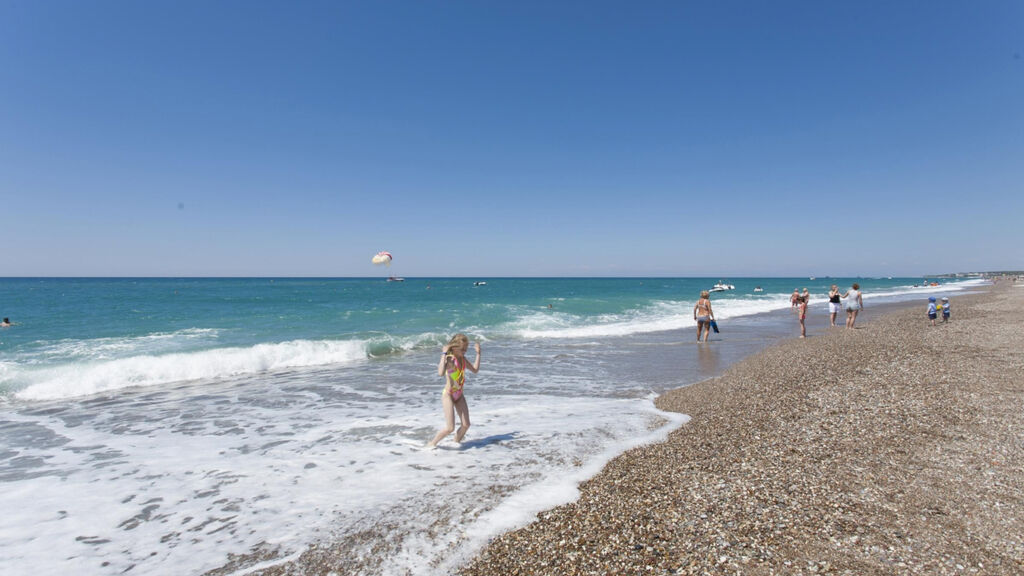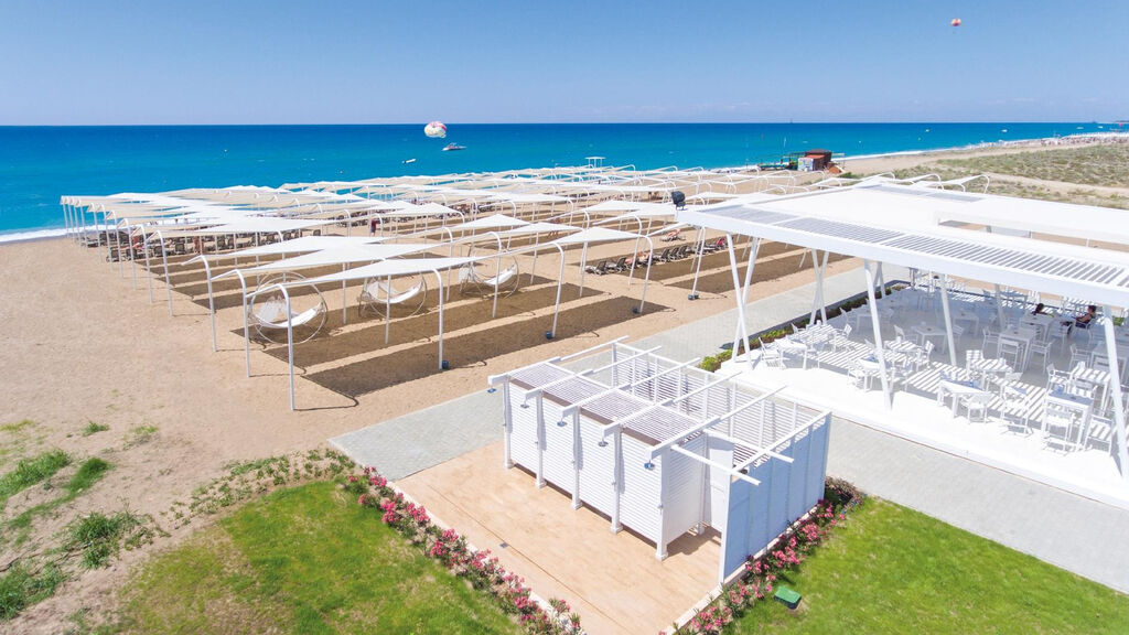 Písečná pláž cca 130 m od hotelu (u vstupy do moře oblázky), lehátka, slunečníky a osušky zdarma, bar na pláži. Pláž je s hotelovým areálem propojena podchodem (tunelem). Hotel poskytuje hostům bezplatný shuttle bus na pláž.