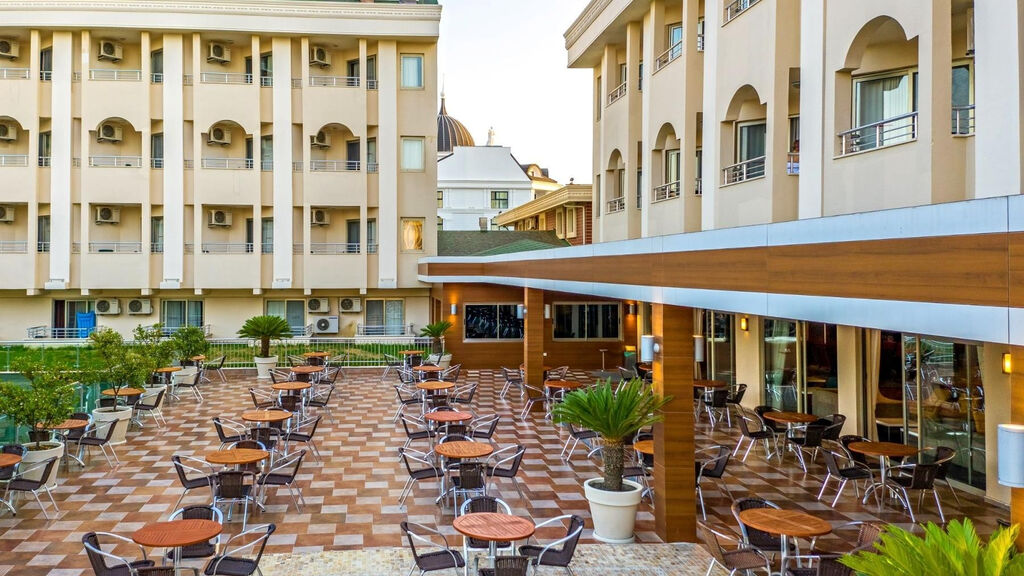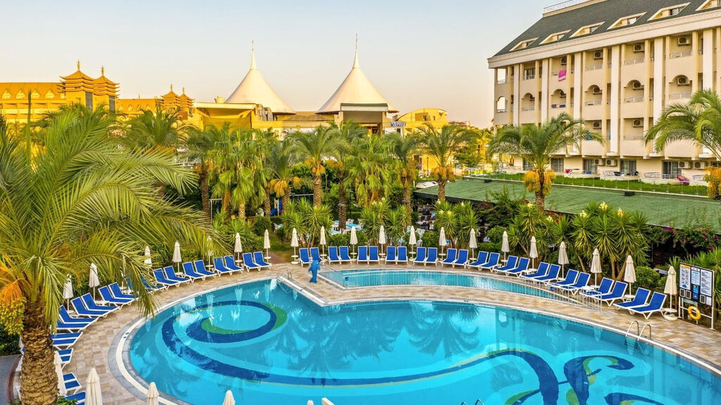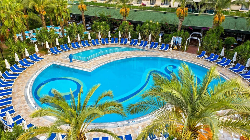 Vybavení hotelu:2 budovy, vstupní hala s recepcí, výtahy, restaurace, à la carte restaurace, bar, společenská místnost s TV/sat., minimarket. V zahradě 2 bazény se skluzavkami, bar u bazénu, terasa na slunění s lehátky a slunečníky zdarma.