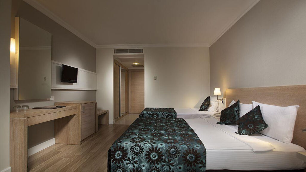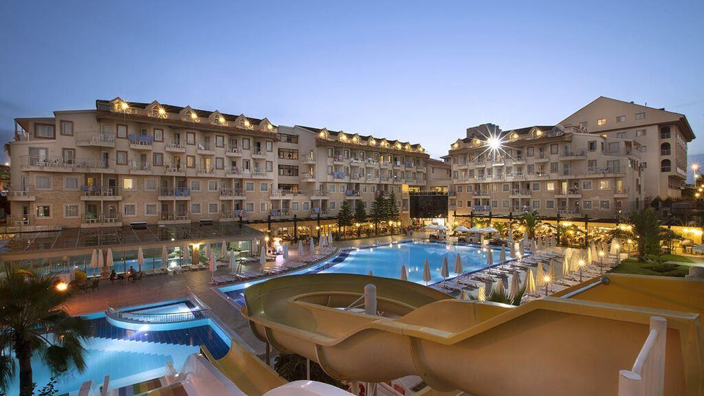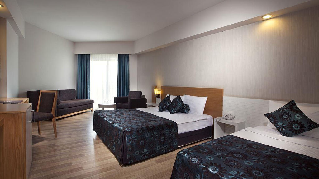 Vybavení hotelu:Celkem 288 pokojů na rozloze 10,000 m2, 4 výtahy, vstupní hala s recepcí, hlavní restaurace, 2 A la Carte restaurace (turecká a rybí 1x za pobyt s rezervací zdarma), plážová restaurace, 4 bary (Lobby bar, bar u bazénu, bar na pláži, bar na diskotéce), patisserie, hlavní bazén, dětský bazén, relaxační bazén, bazén se skluzavkami, vnitřní bazén, lehátka, slunečníky a osušky zdarma, nákupní možnosti, herna (za poplatek), služby kadeřníka (za poplatek), služby lékaře (za poplatek), půjčovna aut (za poplatek), služby fotografa (za poplatek), konferenční místnost.