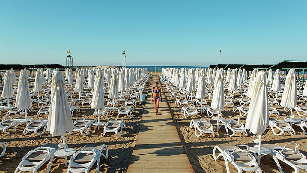 Písečná pláž s pozvolným vstupem do moře oddělená pouze promenádou. Lehátka a slunečníky zdarma, bar na pláži.