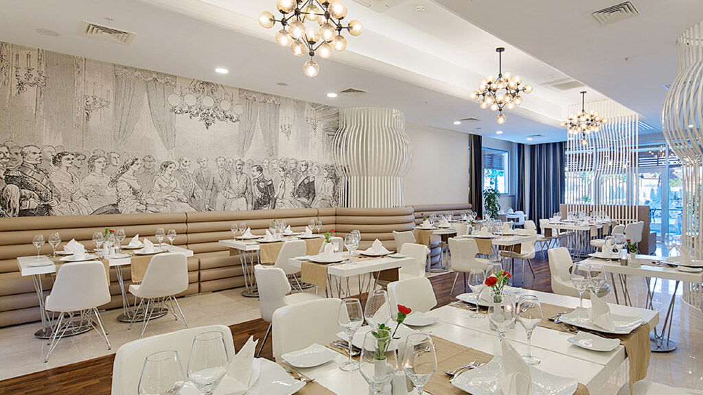 Služby ultra all inclusive zahrnují plnou penzi formou bufetu (snídaně od 7:00 do 10:00 h, obědy od 12:30 do 14:00 h, večeře od 19:00 do 21:00 h) v hlavní hotelové restauraci, pozdní snídaně od 10:00 do 10:30 h, noční občerstvení od 22:00 do 02:00 h, gözleme, wafle, zmrzlinu, odpolední občerstvení, nedělní brunch a neomezenou konzumaci vybraných místních alkoholických a nealkoholických nápojů 24 h denně. Uvedené časy jsou orientační.