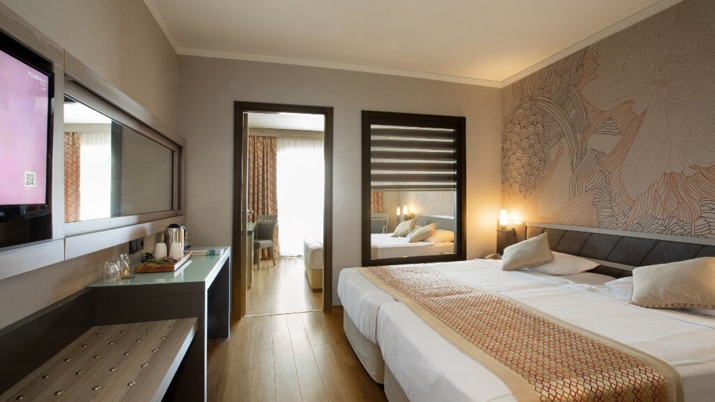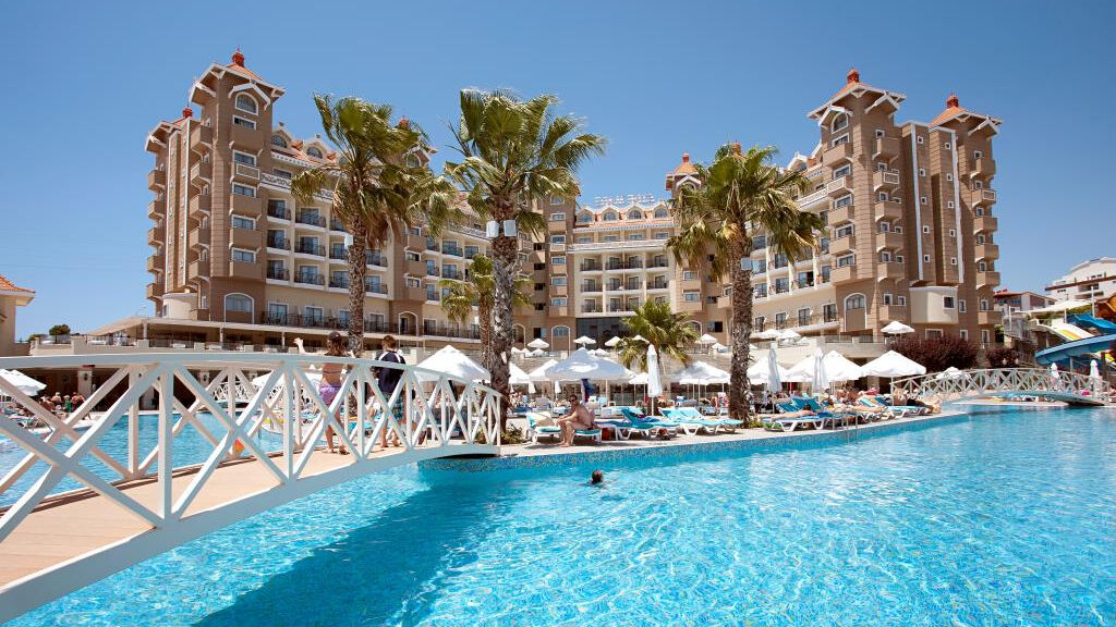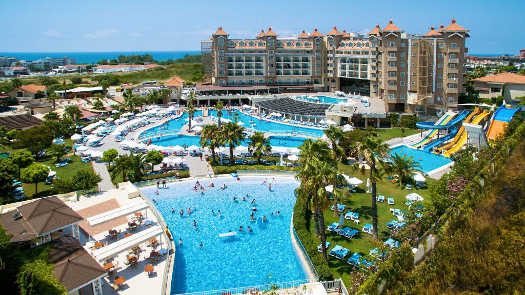 hlavní a vedlejší budova (přímo propojená s lobby v hlavní budově) s 320 pokoji . Lobby s recepcí, výtahy, bufetová restaurace s terasou, bary, obchody. Venku 2 sladkovodní bazény, 5 vodních skluzavek a bazén s vlnami. Lehátka, slunečníky a osušky u bazénu zdarma, výměna osušek za poplatek. a na pláži zdarma. Plážový snack bar.