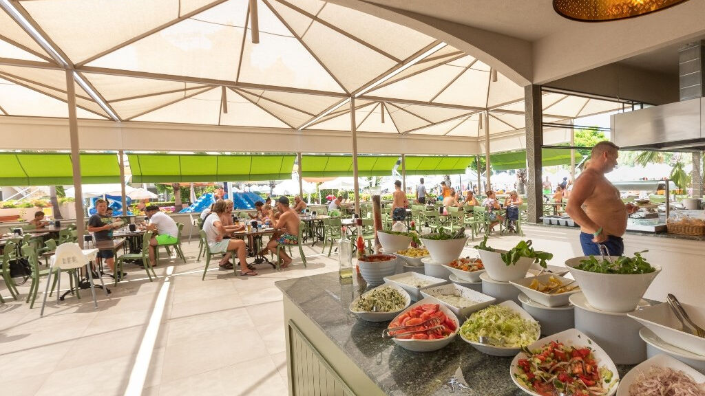 all inclusive. Snídaně, obědy a večeře formou bufetových stolů. Pozdní snídaně. Snacky (v určitých časech) přes den. Odpoledne káva, čaj a koláče. Zmrzlina přes den v určitých časech. Některé nealkoholické a místní alkoholické nápoje od 10.00 do 24.00 h. Minibar je při příjezdu naplněn nealko nápoji a každý den doplňován vodou.
