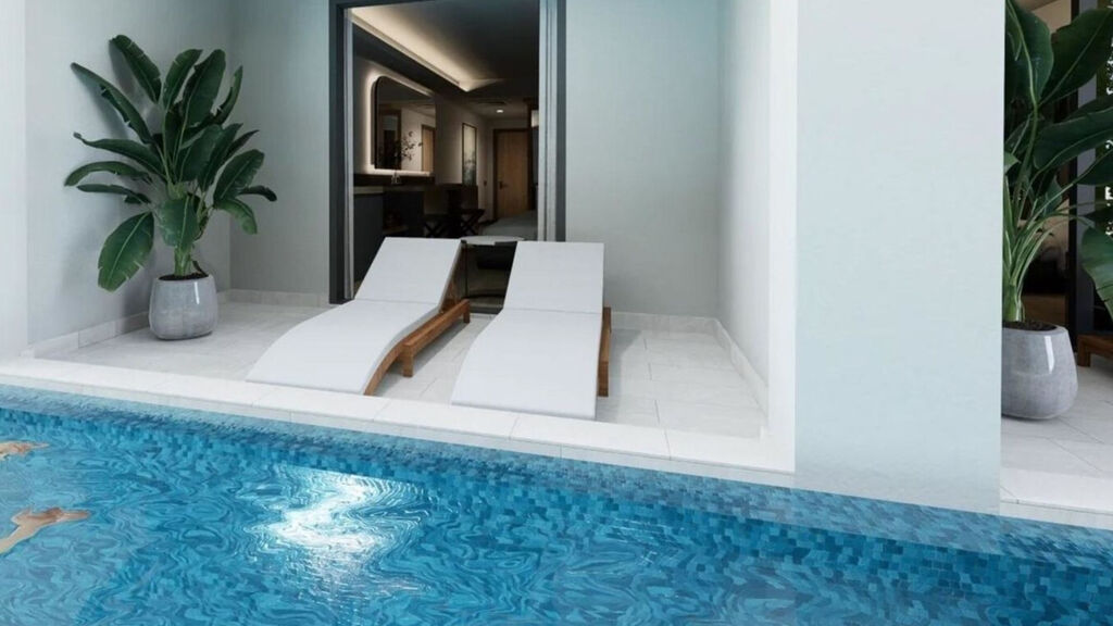 Dvoulůžkový pokoj, Swim Up: přímý vstup do bazénu, prostornější, cca 35 m2.