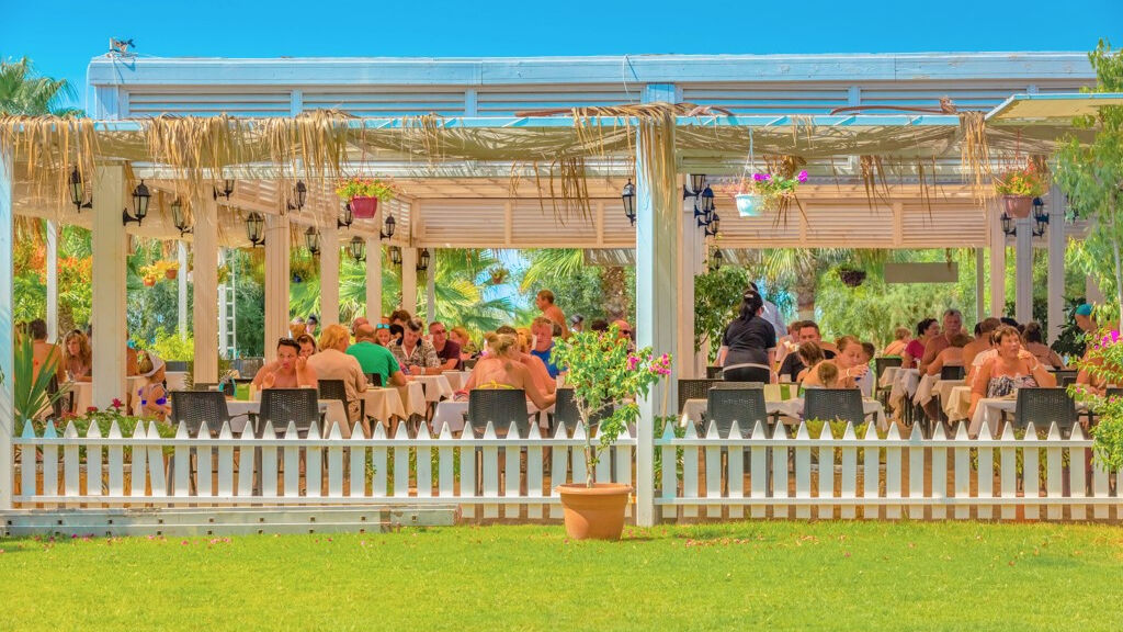 7:00 do 10:00 h, obědy od 12:30 do 14:00 h, večeře od 19:00 do 21:00 h) v hlavní hotelové restauraci, pozdní snídaně od 10:00 do 10:30 h, gözleme, zmrzlinu, odpolední občerstvení, neomezenou konzumaci vybraných místních alkoholických a nealkoholických nápojů. Součástí all inclusive programu je i plážový snack bar. Jedenkrát za pobyt večeře v à la carte restauraci zdarma (nutná předchozí rezervace). Uvedené časy jsou orientační.