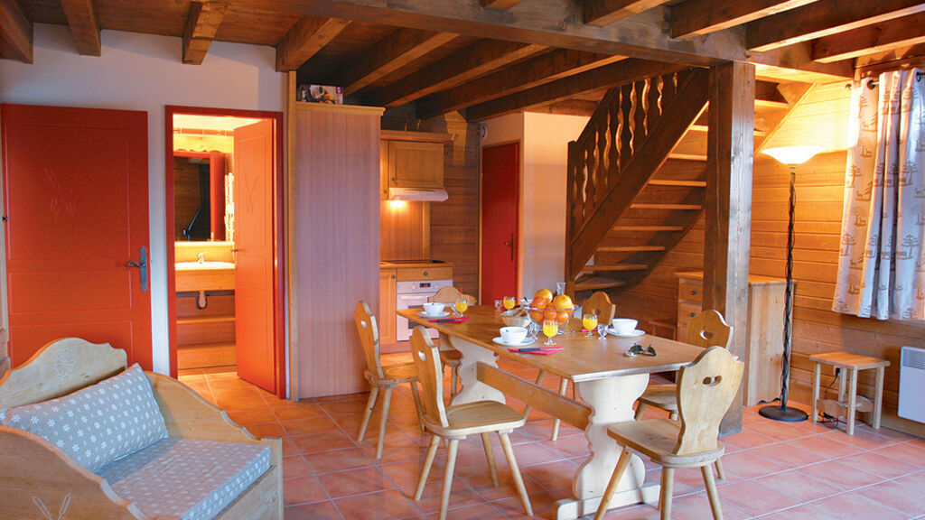 chalet 6 - 50 m² - 1. podlaží chaletu: obývací pokoj s krbem, kuchyňským koutem a rozkládacím gaučem pro 2 osoby (možno i typ "šuplík"), zpravidla balkon; 2. podlaží chaletu: 2 ložnice s manželskou postelí, sociální zařízení se sprchou či vanou