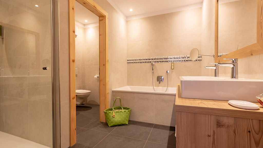 Suite Dolomiti 2/3/4 - 44 m² - pokoj s manželskou postelí, pokoj s rozkládacím gaučem pro 2 osoby, sociální zařízení se sprchou a vanou, balkon