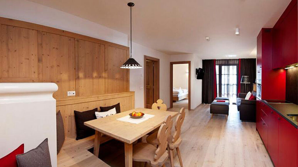 trilo 5 Sigrid - 60 m² - 1 ložnice s manželskou postelí, 1 ložnice s palandou, obývací pokoj s kuchyňským koutem, tyrolskými kamny a rozkládacím gaučem pro 1 osobu, sociální zařízení se sprchou či vanou, balkon