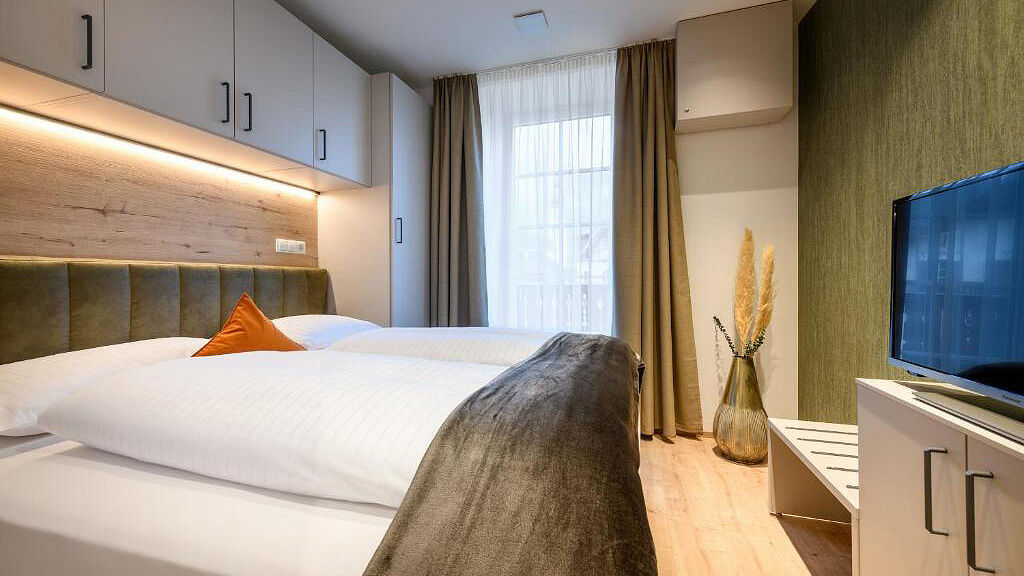 bilo 4 Greta - 43 m² – 1 ložnice s manželskou postelí, obývací pokoj s kuchyňským koutem a rozkládacím gaučem pro 2 osoby, sociální zařízení, 2x balkon