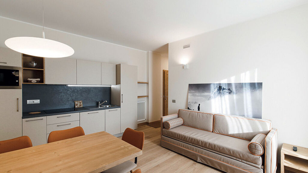 bilo 4 - 37 m² - 1 ložnice s manželskou postelí, obývací pokoj s kuchyňským koutem a rozkládacím gaučem pro 2 osoby, sociální zařízení, balkon (s výjimkou 1 apartmánu)