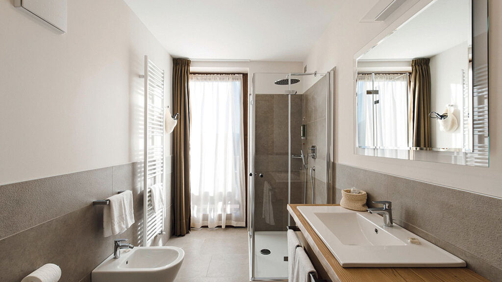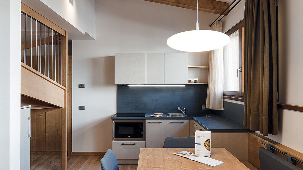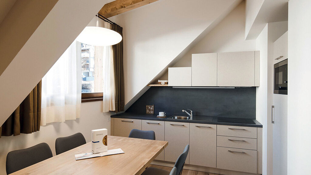 bilo 6 Superior - 60 m² - 1 ložnice s manželskou postelí a 2 samostatnými lůžky v rámci neuzavřeného zvýšeného patra, obývací pokoj s kuchyňským koutem a rozkládacím gaučem pro 2 osoby, 2x sociální zařízení (u 1 apartmánu 1x s párou), balkon (jen u 1 apartmánu); apartmány jsou situovány v podkroví (s výjimkou 1 apartmánu)