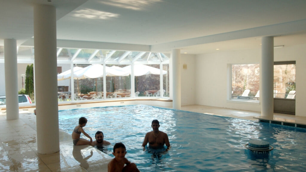 bazén 12 x 6 m s vířivkou až pro 12 osob, lehátky a 2 posilovacími stroji, sauna, pára, multifunkční sprcha, vertikální solárium*, malý relaxační koutek s lehátky, masáže*, kosmetické služby*