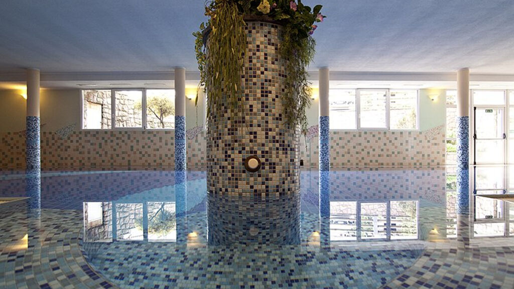 Bazén 16x8 m s protiproudem a vířivkou až pro 6 osob, sauna, pára, termárium, ledová mlha, kneipp terapie, solárium (typ lehátko), relaxační koutek s lehátky, posilovna.