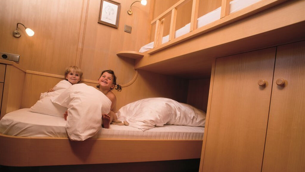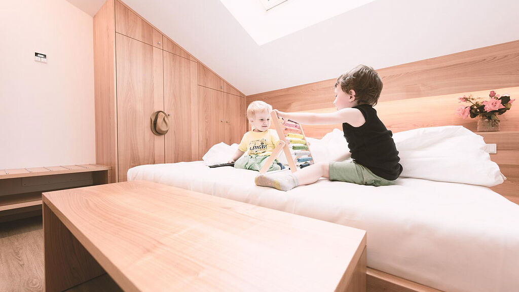 quadrilo 6+2 Family Suite Deluxe - 90 m² - 1. podlaží apartmánu: 1 ložnice s manželskou postelí, obývací pokoj s odděleným kuchyňským koutem a rozkládacím gaučem pro 2 děti do nedovršených 16 let, sociální zařízení, balkon; 2. podlaží apartmánu: 2 ložnice s manželskou postelí, sociální zařízení; maximální obsazenost apartmánu je 6 dospělých a 2 děti do nedovršených 16 let