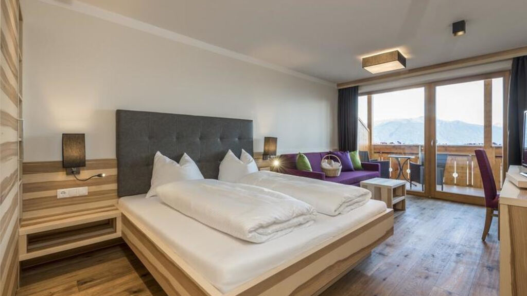 Suite Huberhof 2/3/4/5/6 - 58 m² - pokoj s manželskou postelí a rozkládacím gaučem, prostorný rodinný pokoj s oddělenou částí na spaní pro děti do 14 let s palandou, sociální zařízení, balkon s výhledem na jih