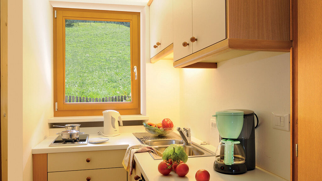 bilo 2+2 small - 47 m² - ložnice s manželskou postelí, obývací pokoj s částečně odděleným kuchyňským koutem a rozkládacím gaučem pro 2 osoby, sociální zařízení se sprchou, terasa 12 m; na terase sauna, lehátko a křesílko