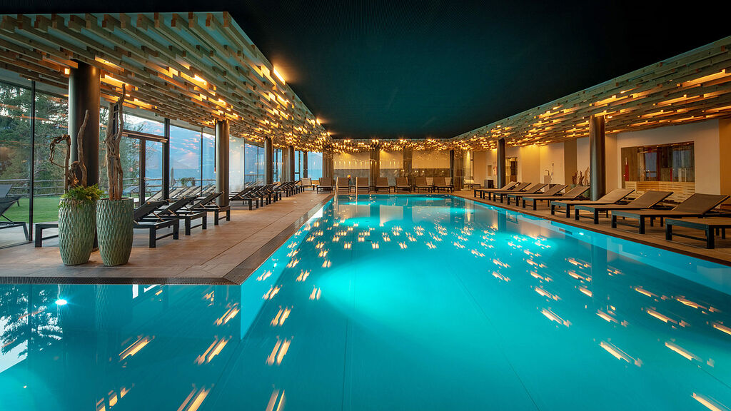 wellness centrum o rozloze 2.500 m² - bazén 18 x 6 m, venkovní vyhřívaný bazén 12 x 6 m, 3x vířivka až pro 6 osob, 4x sauna, pára, 5x relaxační koutek s lehátky, masáže*, kosmetické služby*, posilovna